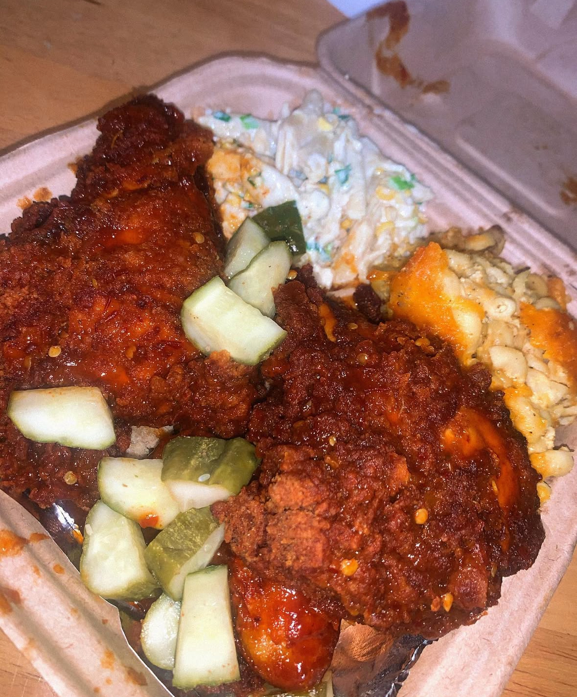 I got the Nashville hot chicken, blue cheese, corn pasta salad, and mac and cheese. The Nashville hot chicken was amazing! The mac and cheese was okay and had decent flavor, nothing to write home about. I couldn’t finish the corn pasta salad because the flavor was bizarre. Main dishes range from $15 to $25.