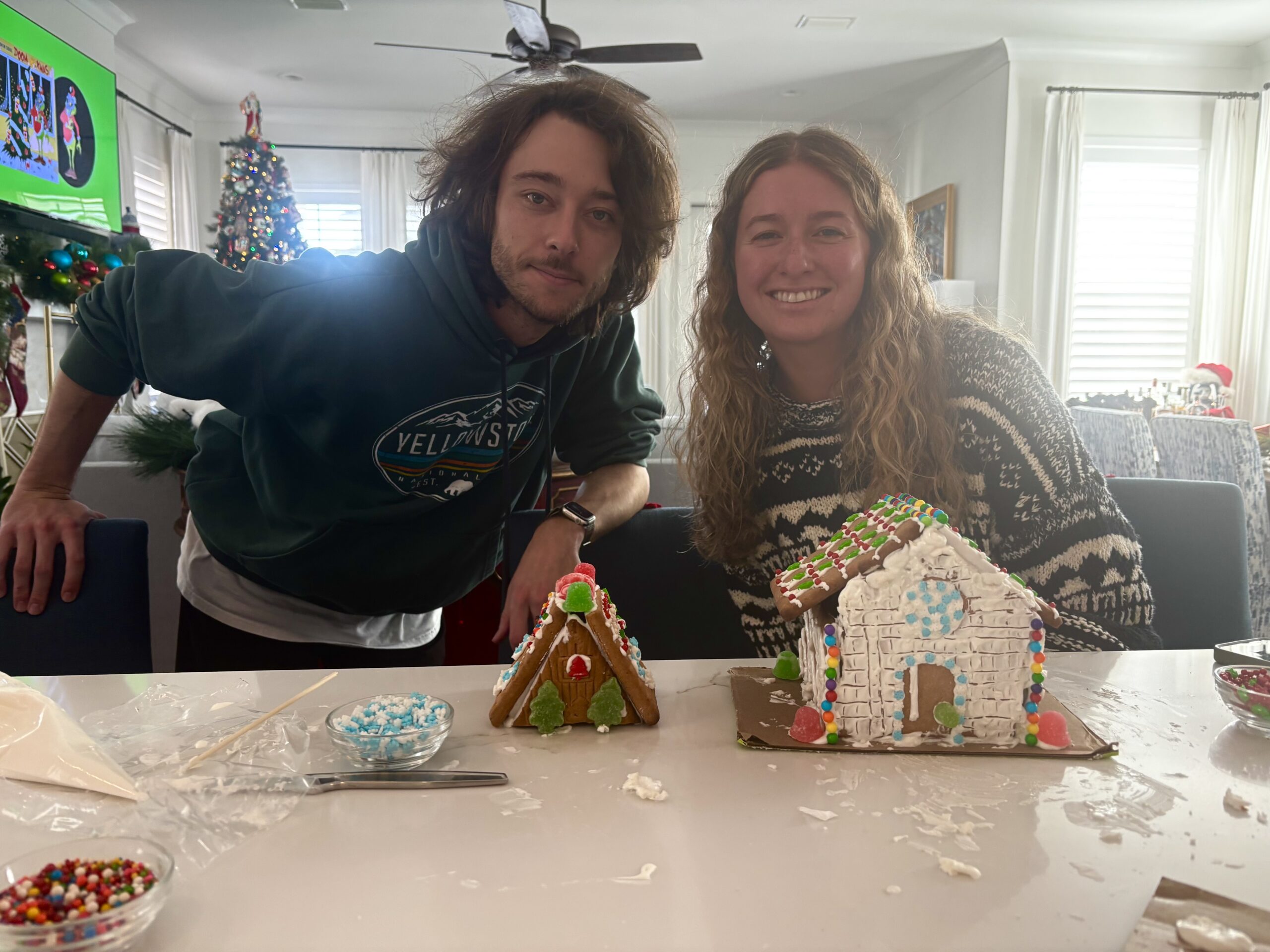Ben and I building gingerbread houses – a tradition his family does each year. Please excuse both our appearances…