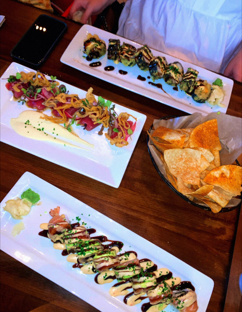 The trio (pictured 1st) was a no brainer to split for the table. The seasoning on the chips was just perfect. The trio is around $14. Their sushi was approved by everyone at the table and, I especially loved tuna based rolls. Their specialty rolls range from $16 to $24.
